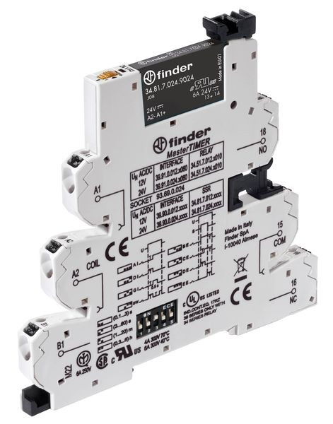 MasterTIMER schmales Zeitrelais für DIN-Schiene, mit Schraubanschlüssen, modular aufgebaut, SSR Kontakte 1 Schließer für 6 A 24 V DC, 8 Zeitablauffunktionen: Ansprechverzögerung, Einschaltwischer, Impulsgeber 0,5 Sek, Symmetrischer Blinkgeber-impulsbeginnend, Rückfallverzögerung über Startkontakt, Ansprech-Rückfallverzögerung über Startkontakt, Einschaltwischer über Startkontakt, Ausschaltwischer über öffnenden Startkontakt, 4 Zeitbereiche bis 6 Std, LED-Anzeige, Klemmen A1 oder A2 und 15+ sind brückbar, Ausgangssicherungsmodul Typ 093.63 für 5 x 20 mm Feinsicherungen anstelle des Blindstopfens einsetzbar, Spulenspannung 24 V AC/DC.