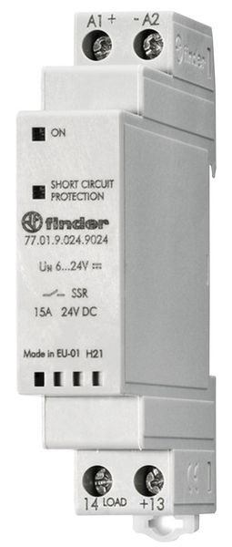 SSR-Relais im 17,5 mm Gehäuse, zum Steuern von elektrischen, pneumatischen und hydraulischen Ventilen. Direkte Ansteuerung von Lasten wie Motoren oder Elektromagneten. Eingangsspannung 6 bis 24 V DC, 1 Schließer für 15 A, Einschaltstrom bis 160 A für 10 ms, Schaltlastspannungsbereich 16 bis 32 V DC, Nennstrom bei DC 13 5 A, Gleichstrom-Motorlast bei DC: 0,2 kW, minimaler Schaltstrom 100 mA, Reststrom (typisch) 3 mA. Kurzschlussschutz. Relaisschutzart IP20, Isolation zwischen Eingang und Ausgang 4 kV (1.2/50 µs), mit Schraubanschlüssen und LED Anzeige.