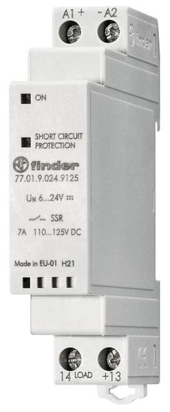 SSR-Relais im 17,5 mm Gehäuse, zum Steuern von elektrischen, pneumatischen und hydraulischen Ventilen. Direkte Ansteuerung von Lasten wie Motoren oder Elektromagneten. Eingangsspannung 6 bis 24 V DC, 1 Schließer für 7 A, Einschaltstrom bis 60 A für 10 ms, Schaltlastspannungsbereich 43 bis 140 V DC. Nennstrom bei DC 13 2,5 A, minimaler Schaltstrom 50 mA, Reststrom (typisch) 6 mA. Kurzschlussschutz. Relaisschutzart IP20, Isolation zwischen Eingang und Ausgang 4 kV (1.2/50 µs), mit Schraubanschlüssen und LED Anzeige.