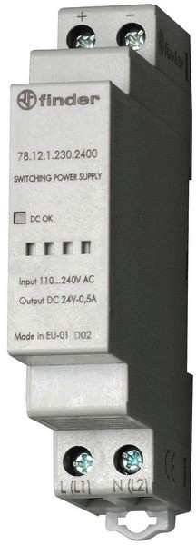 DIN-Schienen Schaltnetzteil, Eingang 110-240 V AC oder 220 V DC, bei AC Spannung schaltet das Netzteil beim Nulldurchgang, Ausgang 12 W bei 24 V DC, Ausgangsnennstrom 0,5 A, interner Thermoschutz, Kurzschlussschutz am Ausgang, Breite 17,5 mm, für Tragschiene 35 mm (EN 60715).