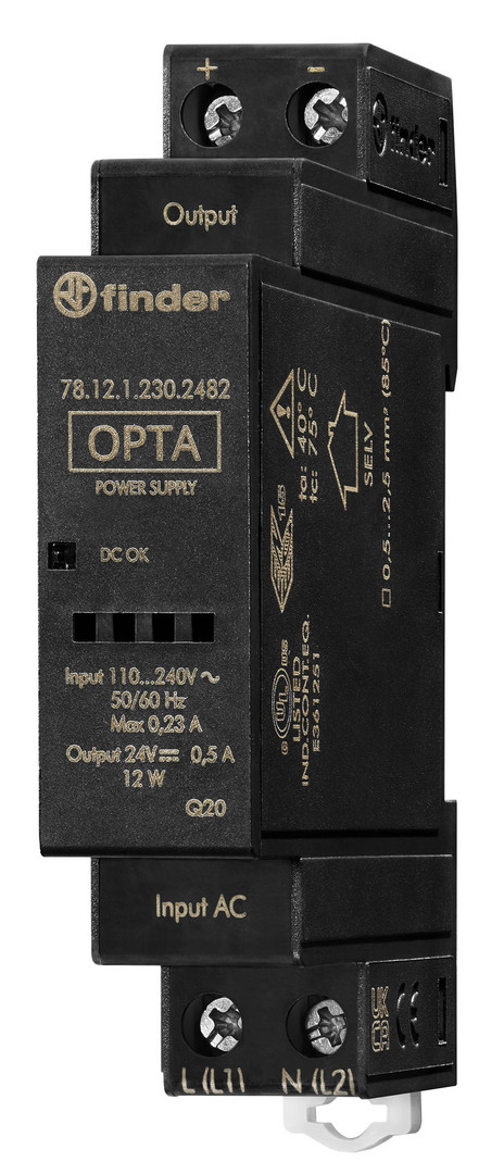 DIN-Schienen Schaltnetzteil, Eingang 110-240 V AC oder 220 V DC, Ausgang 12 W bei 24 V DC, Ausgangsnennstrom 0,5 A, für OPTA PLR - Serie 8A, Gehäusefarbe: schwarz, geeignet für SELV-Anwendungen (EN 60950), interner Thermoschutz, Kurzschlussschutz am Ausgang, Breite 17,5 mm, für Tragschiene 35 mm (EN 60715)
