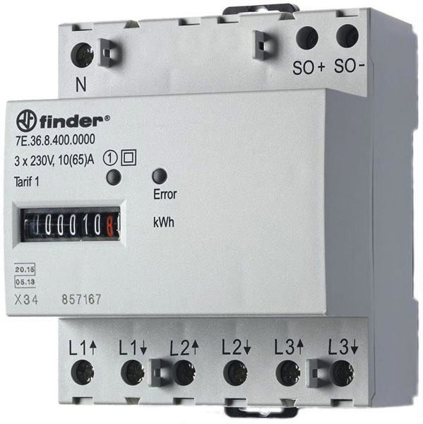 zur Erfassung des Energieverbrauchs in Wechsel- und Drehstromnetzen in Privathaushalten, Gewerbe- und Leichtindustrie, Bauartzulassung der PTB, Genauigkeitsklasse 1/B, Geräteschutzklasse II, hohe Festigkeit gegen magnetische- und mechanische Manipulationen, mit SO-Schnittstelle nach DIN 43864 zum Anschluss an Zentraltarifgeräte und für das Energiemanagement, plombierbar mit Kappe als Zubehör, für Tragschiene DIN EN 60715 TH35 Elektronischer Wirkstromzähler für 3-Phasen Drehstrom, max. Strom 65 A, Genauigkeitsklasse 1/B, Reiheneinbaugerät für 35 mm DIN Schiene EN 60715 TH35, Baubreite 70 mm, Nennspannung 3 x 230 V AC, SO-Schnittstelle nach DIN 43864 (100 Impulse pro kWh), plombierbar, MID konform. Anschlussquerschnitte Hauptstromkreis: eindrähtig 1,5-16 mm², mehrdrähtig 1,5-16 mm².