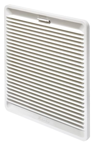 Austrittsfilter für Filterlüfter 7F.20, Baugröße 5, Filtermatte nach Klasse G3, Haube aus Kunststoff nach UL94 V-O, lichtgrau, Filtermaterial aus Kunststofffasern, temperaturbeständig bis 100 °C., selbstverlöschend