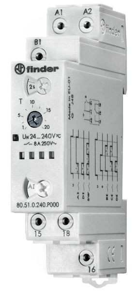 Multifunktions-Zeitrelais mit Push-In-Klemmen für DIN-Schiene, 17.5 mm breit, 1 Wechsler für 8 A / 250 V AC, Kontaktmaterial AgNi. Funktionen: AI: Ansprechverzögerung, DI: Einschaltwischer, SW: Impulsrelais (Blinker) impulsbeginnend, BE: Rückfallverzögerung, CE: Ansprech-/Rückfallverzögerung, DE: Impulsformer (Einschaltwischer), Zeitbereich: 0,1 s - 24 h, Versorgungsspannung: 24-240 V DC/AC (50/60 Hz), Relaisschutzart: IP 20