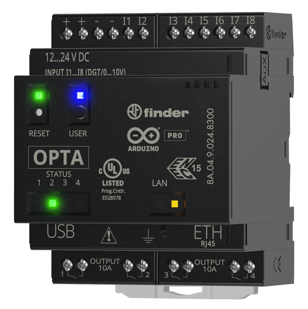 OPTA LITE. Eine Reihe von einfachen und eigenständigen PROGRAMMIERBAREN LOGIKRELAIS ideal für einfache Anwendungen in der industriellen Automatisierung, OEM und Gebäudeautomation IoT. Programmierbar mit herkömmlichen Programmiersprachen (Ladder-Logik) sowie mit innovativen Open Source Programmiersprachen (IDE / ARDUINO). Der Leistungsstarke dual-core Cortex M7+M4 Chip, ermöglicht eine hohe Anzahl an Rechenvorgängen in Echtzeit. Dank eines high-end integrierten Secure-Element-Chips, verwalten Sie Verschlüsselungen und Datenschlüssel in allen Arten von Anwendungen. Versorgungsspannung 12...24 V DC, 8 analoge/ digitale (0-10 V/ 12-24 V) Eingänge/ 4 Relaisausgänge (Schließer, 10A), USB (Typ C) Highspeed-Anschluss für Programmierung und Spannungsversorgung während der Konfiguration, Datenerfassung (über Speichermedium), RJ45 Ethernet (Modbus TCP/IP) Anschluss.