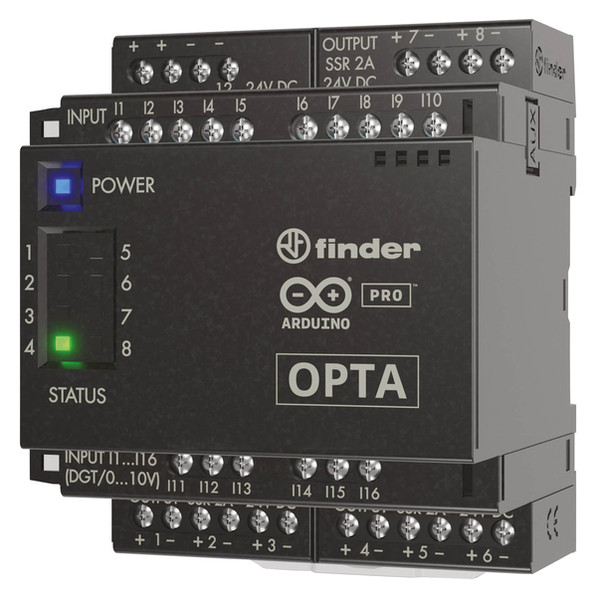 OPTA-Erweiterungsmodul, Programmierung mit Arduino IDE oder mit Arduino PLC-IDE für IEC 61131-3 Programmiersprachen (LD - SFC - FBD - ST - IL), 16 analoge / digitale (0-10V/12-24V) Eingänge, 8 SSR-Ausgänge (2 A), Versorgungsspannung 12…24 V DC, Schnittstelle zu OPTA PLR und Erweiterungsmodulen, insgesamt mit bis zu 5 Erweiterungsmodulen erweiterbar, Power LED und 8 LEDs für Statusanzeige der Ausgänge, 70 mm breit, für Tragschiene 35 mm (EN 60715)