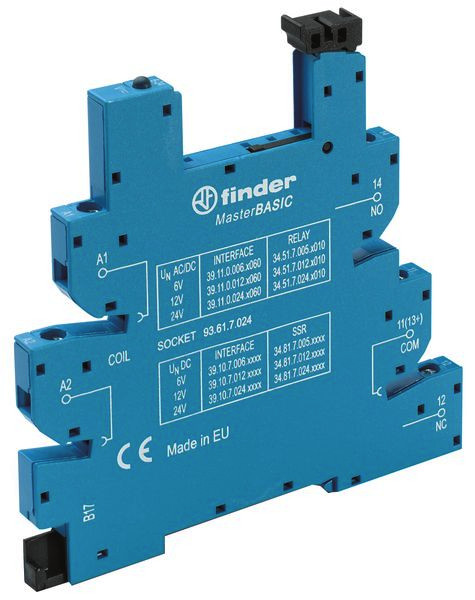 Master Basic Relaisfassung mit Schraubanschlüssen, für DIN-Schiene, Farbe blau, für Relais 34.51 oder 34.81, mit Halte- und Demontagehebel, integrierte Anzeige- und EMV-Entstörbeschaltung der Spule, 'sichere Trennung' nach VDE 0106, Teil 101 Betriebsnennspannungen 6-12-24 V DC