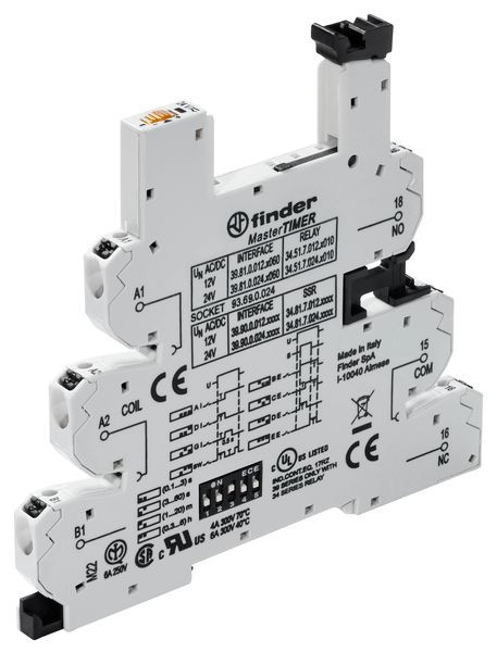 MasterTIMER Relaisfassung mit Push-In-Klemmen, Farbe grau, für Relais 34.51 oder 34.81, mit Halte- und Demontagehebel, integrierte Anzeige- und EMV- Entstörbeschaltung der Spule, 'sichere Trennung' nach VDE 0106, Teil 101 Betriebsnennspannungen 12 - 24 V AC/DC Timerfunktionen: AI= Ansprechverzögerung, DI=Einschaltwischer, SW= Blinker, GI= fester Puls nach Verzögerungszeit, BE=Rückfallverzögerung über Startkontakt, CE=Ansprech-/Rückfallverzögerung, DE= Einschaltwischer über Startkontakt, BE= Ausschaltwischer über öffnenden Kontakte. Zeitbereiche: 4 Zeitbereiche von 0,1 s bis 6 Stunden. Steckvorrichtung für Sicherungsmodul 093.63.