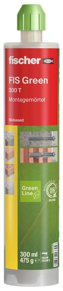 Der fischer Montagemörtel Green 300 T ist ein 2K-Injektionssystem auf Vinylesterbasis. Der Hybrid-Mörtel verfügt über eine Umwelt-Produktdeklaration EPD des Instituts für Bauen und Umwelt und wird mindestens zur Hälfte mit nachwachsenden Rohstoffen produziert. Weiter ist der Montagemörtle Green gemäß der französischen VOC-Verordnung in die bestmögliche Emissionsklasse A+ für flüchtige Stoffe eingestuft. Harz und Härter werden erst beim Auspressen aus dem Statikmischer vermischt und aktiviert. Die Kartusche kann mit einer handelsüblichen Silikon-Auspresspistole ausgepresst werden. Angebrochene Kartuschen können mit einem neuen Statikmischer wieder verwendet werden. Das Hybrid-System bietet mit Systemkomponenten wie Ankerstangen FIS A, Innengewindeankern und Injektions-Ankerhülsen für Befestigungen in Beton und Mauerwerk viele Anwendungsmöglichkeiten im Innen- und Außenbereich.