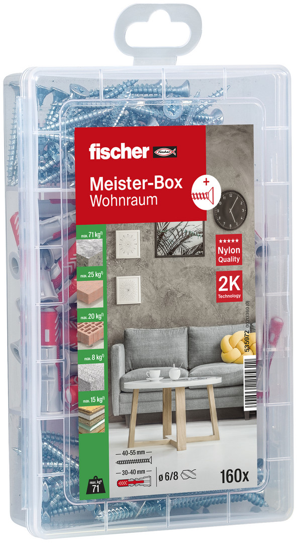 Diese fischer Meister-Box bietet eine praktische und übersichtliche Aufbewahrungslösung als Dübelset mit Schrauben für Werkstatt und Baustelle. Der hochwertige, schlagfeste Kunststoffbehälter mit transparentem Deckel ermöglicht jederzeit einen klaren Blick auf den Inhalt. Die vorsortierte 160-teilige Box enthält 50 x DuoPower 6 x 30, 30 x DuoPower 8 x 40, 50 x Dübelschraube Senkkopf 4,5 x 40 PZ und 30 x Dübelschraube Senkkopf 5,0 x 55 PZ – optimal für die Befestigung im Wohnraum.