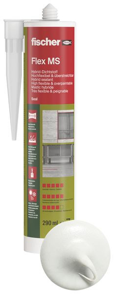 Der fischer Flex MS ist ein einkomponentiger Hybrid-Dichtstoff der mit Luftfeuchtigkeit reagiert und das nahezu ohne Schwund und absolut blasenfrei. Er zeichnet sich durch eine sehr hohe Dehnfähigkeit aus. Er lässt sich sehr gut verarbeiten und besitzt hervorragende Hafteigenschaften auf unterschiedlichsten Untergründen. Der Flex MS haftet auch verlässlich auf feuchten Untergründen. Zudem ist er mit verschiedenen Farbsystemen überstreichbar. Er weist eine hohe Witterungs-, Alterungs- und UV-Beständigkeit auf.