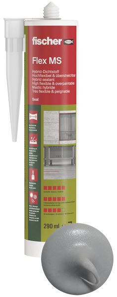 Der fischer Flex MS ist ein einkomponentiger Hybrid-Dichtstoff der mit Luftfeuchtigkeit reagiert und das nahezu ohne Schwund und absolut blasenfrei. Er zeichnet sich durch eine sehr hohe Dehnfähigkeit aus. Er lässt sich sehr gut verarbeiten und besitzt hervorragende Hafteigenschaften auf unterschiedlichsten Untergründen. Der Flex MS haftet auch verlässlich auf feuchten Untergründen. Zudem ist er mit verschiedenen Farbsystemen überstreichbar. Er weist eine hohe Witterungs-, Alterungs- und UV-Beständigkeit auf.