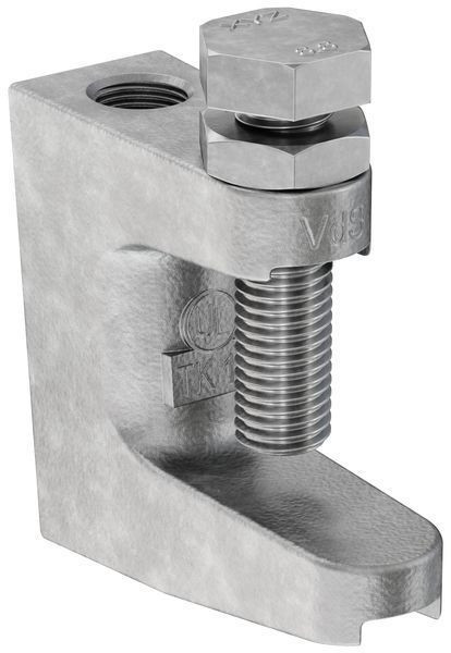 Die fischer Trägerklammer TKL L mit Gewindeaufnahme ermöglicht ein einfaches Befestigen durch Klemmen an Stahlträgern ohne schweißen oder bohren. Für VdS-Anlagen sind ab Rohrleitung DN 65 Sicherungslaschen erforderlich. Der Hohlschliff der Befestigungsschraube verhindert wirksam das Abrutschen vom Stahlträger.