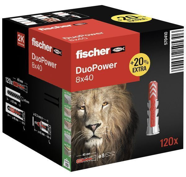 Der fischer DuoPower bietet sehr gute Haltewerte durch 2 Komponenten: Die graue Komponente aus hochwertigem Nylon aktiviert je nach Baustoff automatisch das optimale Funktionsprinzip (Spreizen, Klappen, Knoten) für besten Halt. Die Expansionsflügel der roten Komponente unterstützen die sichere Verspreizung und bieten zusätzliche Sicherheit zur grauen Komponente. Einfaches Eindrehen der Schraube und richtiges „Ziehen“ zum Schluss. Kein Überdrehen der Schraube. Der am Dübelkopf angeformten Rand verhindert, dass der Dübel ins Bohrloch rutscht. Die mitgelieferten Schrauben sind optimal auf den fischer Spreizdübel DuoPower abgestimmt.