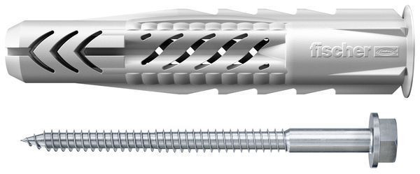 Das fischer Montageset Flachbild-TV Halterung beinhaltet alle Elemente zur sicheren Befestigung von Flachbild-TV Halterungen: 4 fischer Dübel UX 8 x 50 mit ausgeprägtem Rand aus hochwertigem Nylon und 4 Sechskant-Sicherheitsschraube 6,0 x 66 mit Sechskantkopf.