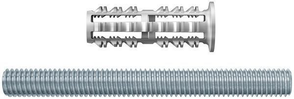 Der fischer Gewindestangendübel FGDmit Gewindestange ist eine wirtschaftliche Einschlaglösung für Befestigungen in Vollbaustoffen. Mithilfe des Kunststoffdübels werden handelsübliche Gewindestangen ohne spezielles Setzwerkzeug mit dem Hammer einfach und schnell eingeschlagen. Der kurze Dübelkörper reduziert Bohraufwand und vermeidet Bewehrungstreffer. Die Setzrichtigkeit wird mithilfe des sichtbaren Dübelrands zur visuellen Setzkontrolle garantiert. Zur Sicherstellung einer einheitlichen Setztiefe wird die geschlossene Dübelspitze als Anschlagpunkt genutzt. Diese kann auch als Sollbruchstelle das Nachjustieren und tiefere Einschlagen der Gewindestange ermöglichen.