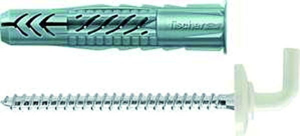 Der fischer Universaldübel ist der Allrounder aus hochwertigem Nylon. Der Dübel hält in Beton, aber auch in Porenbeton, im Mauerwerk und in Gipskarton- und Gipsfaserplatten. In diesen Baustoffen verknotet der Dübel. Praktisch ist der angeformte Rand. Damit rutscht der Dübel beim Einstecken nicht ins Bohrloch. In der Verpackung sind bereits weiße, nylonbeschichtete Winkelhaken mit dabei. Das spart die Sucherei und garantiert, dass diese auch optimal zum Dübel passen. Mit dem fischer Universaldübel UX mit Winkelhaken können beispielsweise Bilder, Bords und Hängeschränke befestigt werden.