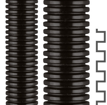 Vollkunststoff-Wellschlauch ROHRflex PA 6-HT, V2 (UL 94) Ringe, für hohe Temperaturen, innen und außen gewellt, schmales Profil Material: Kunststoff (PA), Farbe: schwarz Temperaturbereich: -25°C...+150°C ^ +170°C Zulassungen: UK-CA / CE / REACH und RoHS konform Eigenschaften: luft- und flüssigkeitsdicht / ölbeständig bis +80°C / benzinbeständig / weitgehend säure- und lösungsmittelbeständig / silikon-, cadmium-, halogenfrei / selbstverlöschend / flammwidrig / UV-beständig Einsatzbereich: Maschinenbau / Anlagenbau / Fahrzeugbau / Elektroanlagen