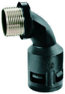 | Kurzbeschreibung | Kunststoff-Schnellverschraubung 90° Bogen für Wellschlauch, schwarz, Messingaußengewinde metrisch, hochdichtend, AD 34,5, M 40 x 1,5 |