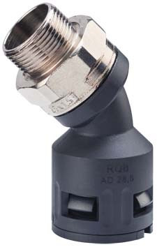 | Kurzbeschreibung | Kuntstoff-Schnellverschraubung 45° Bogen für Wellschlauch, schwarz, metrisches Messingaußengewinde drehbar, hochdichtend, AD 21,2, M 20 x 1,5 |