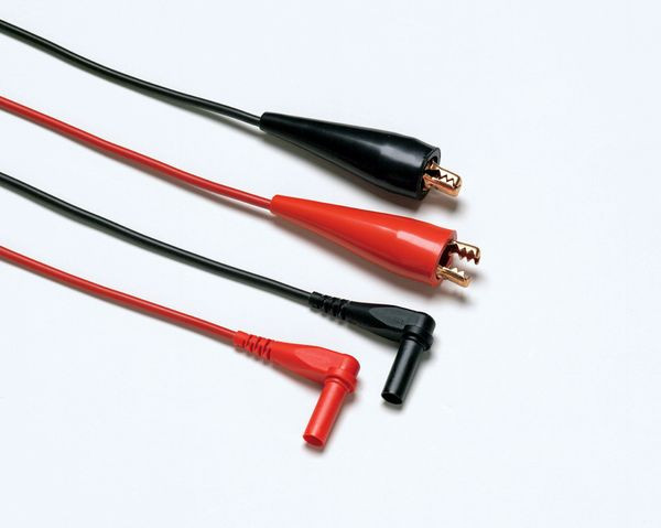 Messleitungssatz mit Krokodilklemmen und Winkelstecker. Die flexiblen silikonisolierten Messleitungen sind hitze- und kältebeständig, CAT I 30 V, 10 A