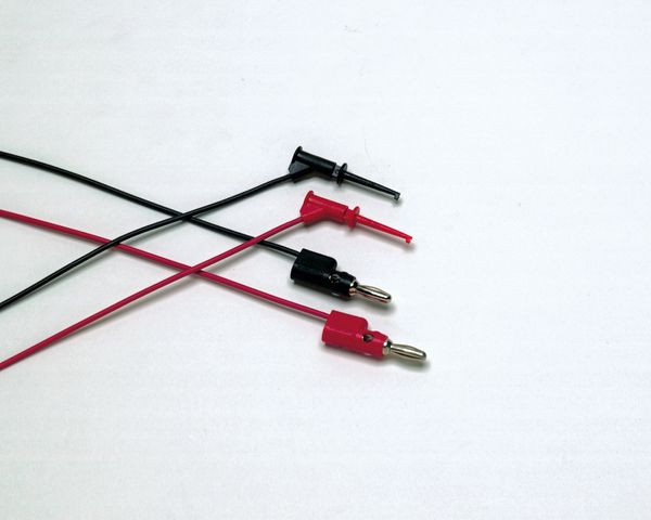 1 Paar Messleitungen (rot, schwarz) mit stapelbaren 4-mm-Bananensteckern und Mikro-Hakenklemmen. Mikro-Hakenklemmen können an Bauelementanschlüsse bis zu 1 mm Durchmesser angeschlossen werden, 90 cm lange PVC-isolierte Leitungen.