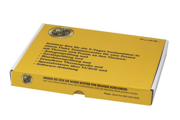 Seminar-Box mit Registrierungscode für ein 5-Tages Fachseminar in einem Fluke Seminarcenter mit Theorie und Praxis zu den Themen: Anlagenprüfung und Geräteprüfung und Maschinenprüfung und Grundkurs Thermografie und Spezialwissen über FI/RCD und Software-Schulung.