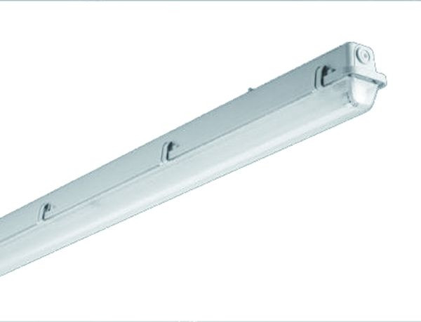 Feuchtraumwannenleuchte für LED-Röhre. Kurzschlussschutz dank eingebauter Feinsicherung. Leuchtenunterteil aus glasfaserverstärktem Polyester, hellgrau, schwer entflammbar. Wanne aus UV-beständigem Polymethylmethacrylat (PMMA), geperlt. Kunststoff-Clip-Verschlüsse.