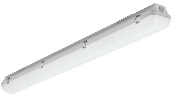 LED Feuchtraumwannenleuchte mit integrierter Durchgangsverdrahtung. Schaltbar über integrierten HF-Sensor. Gehäuse aus schwer entflammbarem, glasfaserverstärktem Polyester (GRP), hellgrau. Alterungsbeständige, geschäumte PU-Dichtung. LED-Optiksystem auf weißem Geräteträger montiert. Opale Wanne aus UV-stabilisiertem Polycarbonat (PC) mit innenliegenden Längsprismen. Hochwertige Verschlüsse aus Edelstahl. Anschlussklemme in Steckkontakttechnik. Halogenfreie Verdrahtung. Geeignet für die Montage an Wand, Decke, Tragschiene (TRA) oder gependelt. Einfache Befestigung mit multifunktionalen Schnellmontage-Befestigungsklammern aus Edelstahl. Ausrichten der Leuchte durch den variablen Verschiebebereich um 60 mm. Zugelassen für den Einsatz in Innenbereichen oder überdachten Außenbereichen. Die LED-Module sind durch eine autorisierte Fachkraft austauschbar.