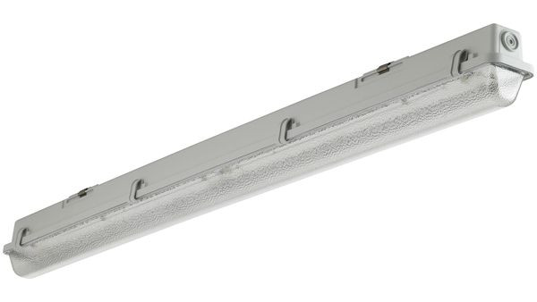LED Feuchtraum-Wannenleuchte mit Gehäuse aus schwer entflammbarem, glasfaserverstärktem Polyester (GRP) hellgrau. Alterungsbeständige, geschäumte Polyurethandichtung (PU). Mit integriertem LED-Konverter. Geräteträger weiß aus Stahlblech. Die LED-Module sind durch eine autorisierte Fachkraft austauschbar. Wanne aus UV-beständigem Polymethylmethacrylat (PMMA), glasklar, innen geperlt, aussen glatt. Wannenverschluss aus Edelstahl. Einfache Deckenbefestigung mit beiliegenden multifunktionalen Schnellmontage-Befestigungsklammern aus Edelstahl (Leuchte einklipsbar). Ausrichten der Leuchte durch den variablen Verschiebebereich um 60 mm. Leuchte mit begrenzter Oberflächentemperatur, für Bereiche, in denen leitfähige Stäube zu erwarten sind.