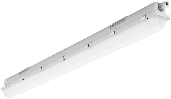 LED Feuchtraum-Wannenleuchte, mit integrierter Durchgangsverdrahtung. Gehäuse aus schwer entflammbarem, glasfaserverstärktem Polyester (GRP) hellgrau. Alterungsbeständige, geschäumte Polyurethandichtung (PU). Mit integriertem LED-Konverter. Geräteträger weiß aus Stahlblech. Die LED-Module sind durch eine autorisierte Fachkraft austauschbar. Wanne aus UV-beständigem Polymethylmethacrylat (PMMA), opalisiert. Wannenverschluss aus Edelstahl. Einfache Deckenbefestigung mit beiliegenden multifunktionalen Schnellmontage-Befestigungsklammern aus Edelstahl (Leuchte einklipsbar). Ausrichten der Leuchte durch den variablen Verschiebebereich um 60 mm. Leuchte mit begrenzter Oberflächentemperatur, für Bereiche, in denen leitfähige Stäube zu erwarten sind. Die Leuchte ist darauf ausgelegt, dass deren Reinigung mit einem Hochdruck-Dampfstrahlreiniger möglich ist (IP69K, Strahldruck max. 80 Bar bei max. 80°C Wassertemperatur, Abstand min. 15cm).