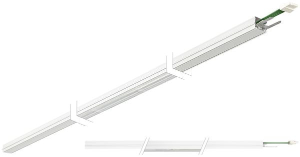 TRF LED-Lichtleiste mit einreihiger, linearer Lichtoptik aus PMMA. Wide Beam, 90° Abstrahlwinkel. Tragschiene und Lichteinsatz sind eine Einheit. Gehäuse aus profiliertem Aluminium mit Durchgangsverdrahtung, Stecksystem und Schnellverschlüssen.