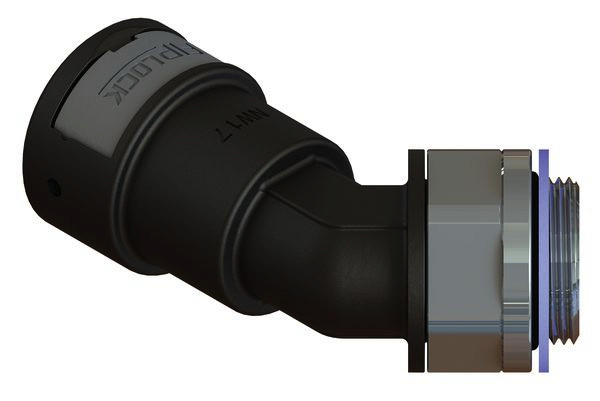 FIPLOCK®ONE Anschlussverschraubung Winkel 45° AAPA-MMK-S aus speziell modifiziertem Polyamid 6, halogenfrei, UV-Beständig mit kurzen, drehbaren, metrischen Metallgewinde aus Messing vernickelt. Erfüllt die Schutzklassen IP66, IP67, IP68 und IP69. Das 360° Verriegelungssystems lässt sich mit Hilfe eines handelsüblichen Schlitz-Schraubendrehers einfach öffnen.