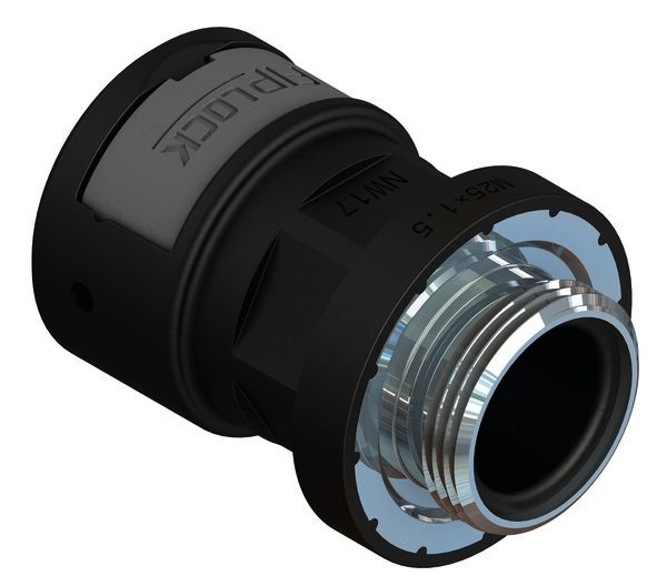 FIPLOCK®ONE Anschlussverschraubung gerade ASPA-MMK aus speziell modifiziertem Polyamid 6, halogenfrei, UV-Beständig mit kurzen metrischen Metallgewinde aus Messing vernickelt. Erfüllt die Schutzklassen IP66, IP67, IP68 und IP69. Das 360° Verriegelungssystems lässt sich mit Hilfe eines handelsüblichen Schlitz-Schraubendrehers einfach öffnen.