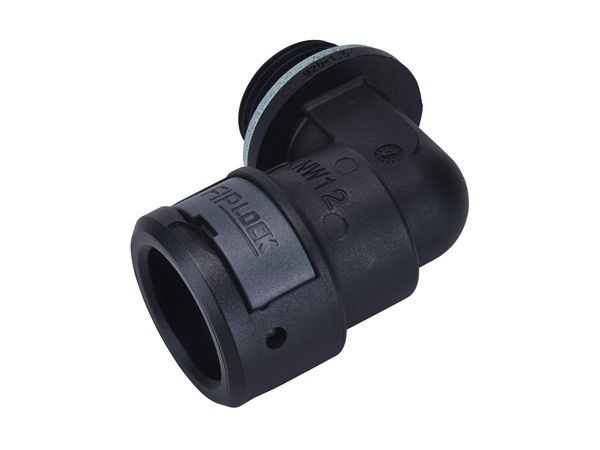 FIPLOCK®ONE Anschlussverschraubung Winkel 90° AWPA-M aus speziell modifiziertem Polyamid 6, halogenfrei, UV-Beständig mit metrischen Kunststoffgewinde. Erfüllt die Schutzklassen IP66, IP67, IP68 und IP69. Das 360° Verriegelungssystems lässt sich mit Hilfe eines handelsüblichen Schlitz-Schraubendrehers einfach öffnen.