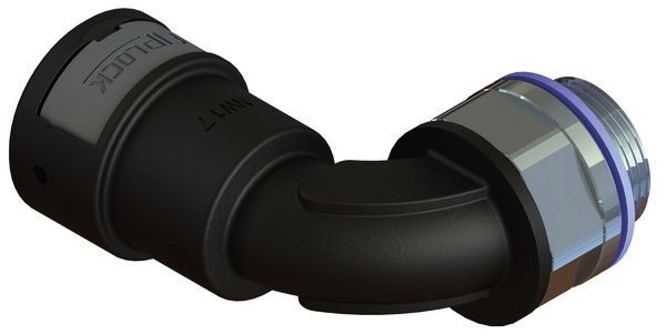 FIPLOCK®ONE Anschlussverschraubung Winkel 90° AWPA-MML-S aus speziell modifiziertem Polyamid 6, halogenfrei, UV-Beständig mit langen, drehbaren, metrischen Metallgewinde aus Messing vernickelt. Erfüllt die Schutzklassen IP66, IP67, IP68 und IP69. Das 360° Verriegelungssystems lässt sich mit Hilfe eines handelsüblichen Schlitz-Schraubendrehers einfach öffnen.