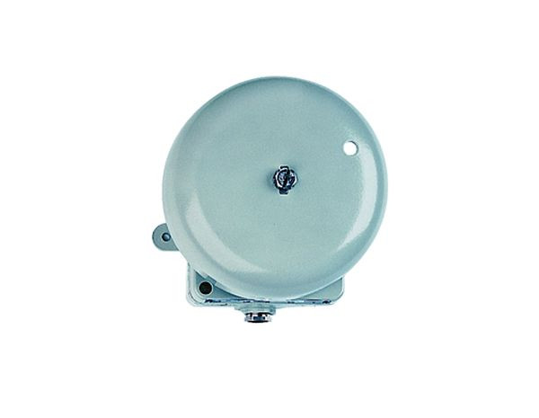 Schnellschlagwecker, große Lautstärke, Leichtmetallgehäuse, hellgrau, zur Montage in feuchten Räumen und im Freien, mit Stahl-Flachschale 150 mm, Schalldruckpegel ca. 105 dB (A), 1 m. Auch erhältlich mit Flachschalendurchmesser 250 mm, dann 110 dB (A).