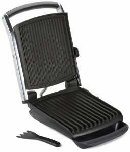 Quantanium 4fach Antihaftbeschichtung, speziell abgewinkelte Auflagerippen halten das Fleisch vom glösten Fett fern, abnehmbare Fettauffangschale, arretierbare Höhenverstellung, variable Temperaturkontrolle mit Kontrollleuchte, Rezeptbuch