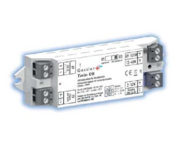 Leuchtenbaustein TWIN09 für Mischbetrieb sowie Adressbaustein zur Einzelleuchtenüberwachung und zusätzlichem Schalteingang, unter Einsatz des Gessler TWIN09-Bausteins können die drei Schaltungsarten (Dauer-, Bereitschafts- und geschaltetes Dauerlicht) in einem Stromkreis realisiert werden, das bedeutet eine erhebliche Einsparung bei der Installation bzw. Reduzierung der Brandlast, die angeschlossenen Leuchten können überwacht und mit der Allgemeinbeleuchtung mitgeschaltet werden, die Datenübertragung erfolgt auf der Versorgungsleitung vom Zentralbatteriesystem, bei Störung einer einzelnen Leuchte kann der genaue Standort auf dem Display der Zentralanlage angezeigt werden, nur für Sibecontrol und NANO2 geeignet!