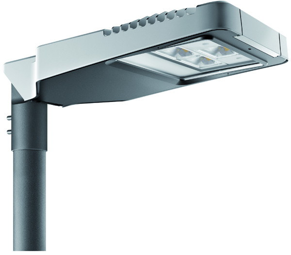 Strassenleuchte in LED- Technik Road 5, Gehaeuse aus Aluminium-Druckguss mit Klimamembran. Farbe Leuchtenkoerper Aluminium / Glasrahmen Graphitgrau, Reflektoren aus bedampften Polycarbonat, mit Flachglasabdeckung aus gehaertetem Sicherheitsglas, Leuchten werkzeuglos zu oeffnen, Die Elektrokomponentenplatte ist werkzeuglos austauschbar. Die Leuchte ist fuer Mastaufsatz mit einem Neigungswinkel von -10° bis +20° und bei Mastansatz mit einem Neigungswinkel von -20° bis +10° einsetzbar.