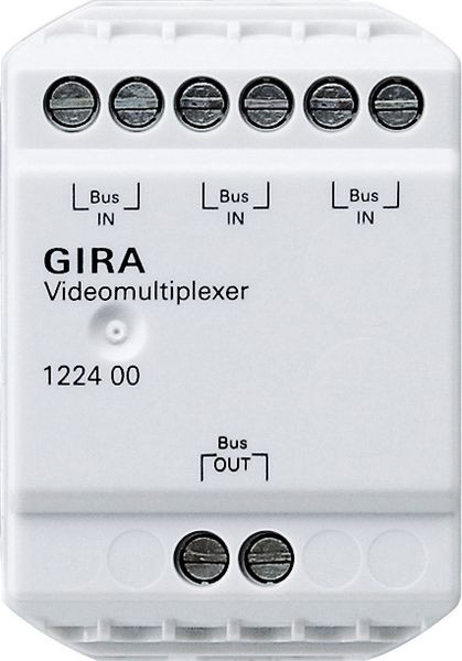 - Ein Videomultiplexer kann die Videosignale von drei Türstationen mit Farbkamera zusammenführen. Mit zwei Videomultiplexern können die Videosignale von bis zu fünf Türstationen zusammengeführt werden.