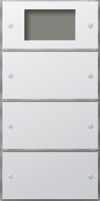 Grafik-Display mit Hintergrundbeleuchtung und vielfältigen Anzeigemöglichkeiten (Temperatur, Uhrzeit, Datum, Alarm und Hinweistexte), mehrfarbige Status-LED (rot, grün, blau) über die ETS parametrierbar, zwei Status LED je Bedienfläche, Betriebs-LED weiß, Integrierter Temperatursensor zum Messen und Weiterleiten der lokalen Raumtemperatur, Montage auf Busankoppler 3 oder externer Fühler, Projektierung und Inbetriebnahme erfolgt ab ETS3.0d Patch A, Demontageschutz durch Verschraubung, neutrale Beschriftungsschilder im Lieferumfang