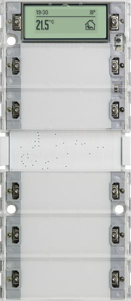 Grafik-Display mit Hintergrundbeleuchtung und vielfältigen Anzeigemöglichkeiten (Temperatur, Uhrzeit, Datum, Alarm und Hinweistexte), mehrfarbige Status-LED (rot, grün, blau) über die ETS parametrierbar, zwei Status LED je Bedienfläche, Beschriftungsfeldbeleuchtung, integrierter Temperatursensor zum Messen und Weiterleiten der lokalten Raumtemperatur, Montage auf Busankoppler 3, Projektierung und Inbetriebnahme erfolgt ab ETS3.0d Patch A, Demontageschutz durch Verschraubung, inkl. neutraler Beschriftungsfelder