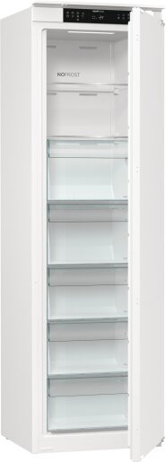 Der Gorenje Einbau-Gefrierschrank mit einem Gesamtvolumen von 235 Litern bietet großzügigen Stauraum und moderne Funktionen. Mit Energieeffizienzklasse E und einem jährlichen Verbrauch von 244 kWh ist er stromsparend. Dank NoFrost-Technologie entfällt das manuelle Abtauen, während FastFreeze für schnelles Einfrieren sorgt. Die elektronische Steuerung über ein LED-Display ermöglicht präzise Temperaturregelung, und ein akustisches Warnsignal informiert bei zu langer geöffneter Tür oder zu hoher Temperatur. Mit fünf Schubfächern, zwei Regalen und einem klassischen Eiswürfelbehälter ist die Organisation des Inhalts einfach. Der wechselbare Türanschlag sowie höhenverstellbare Füße sorgen für Flexibilität bei der Installation.