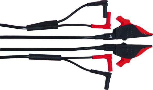 Kelvin Zange - bis 30 mm Öffnung. KC4: Kelvin Clips (1 Set = 2 Stück) für 4-pol-Anschluss von niederohmigen Prüfobjekten, Leitungslänge 120 cm, Zange für Anschlüsse an Messobjekte bis 30 mm Ø. Die Kelvin Clips verbinden niederohmige Widerstande (z.B. Kontaktwiderstande, Shunts, ...) mit einem Widerstandsmessgerat in Vierpoltechnik. Dadurch wird der Zuleitungswiderstand kompensiert. KC4 besteht aus 1 Paar Klemmen. .