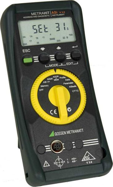 ASi-Bustester - Diagnose- und Adressiertool, ASi-Version 3.0. Das handliche, robuste Adressier- und Diagnose-Werkzeug für Inbetriebnahme, Wartung und Service von ASi-Systemen bietet folgende Funktionen: . Das METRAHIT ASi v3.0 ist ein leicht bedienbares Adressier- und Diagnosegerät für aktive ASi-Module, intelligente Sensoren und Aktuatoren entsprechend der ASi Version 3.0 inklusive erweitertem Adressmode.. Komplexe Slaves mit hohem Betriebsstrom bis 150mA ohne externe Versorgung adressierbar. Längere Betriebszeit. Gleichzeitige Darstellung der Ein- und Ausgangszustände mit dem erweiterten 8-stelligen Display und dadurch ein übersichtlicher und schneller Ein- und Ausgangstest von Anlagen. Intuitive Erfassung der Prozesswerte durch wahlweise binäre, dezimale, hexadezimale oder prozentuale Darstellung der Daten. Universell einsetzbar mit Standard AS-i und AS-i Power 24 V Netzen.. Schnellere Inbetriebnahme durch vereinfachte Bedienschritte beim Einstellen der Slave-Adresse und automatischem Rücklesen der gesetzten Adresse.Schneller einsatzfähig da die Adressierleitung auch ohne Festschrauben in M12-Buchse funktioniert.Einhandbedienung im bewährten Kompaktgehäuse mit leichtgängigen Tasten und Drehschalter . . Mit dem METRAHIT ASi v3.0 werden AS-Interface Slaves bei der Inbetriebnahme Adressen zugewiesen. Es erkennt ein angeschlossenes Slave-Modul oder ein komplettes AS-i Netz und zeigt die gefundenen Module im Display an. Mit den Auf- und Ab-Tasten wird jede Adresse individuell eingestellt. Weitere Inbetriebnahme-Funktionen werden mit dem Drehschalter ausgewählt. Das neue METRAHIT ASi v3.0 unterstützt die aktuelle AS-i Spezifikation V3.0 und die E/A-Daten neuester Slaves. Das Display wurde auf 8 Stellen erweitert und die Strombelastbarkeit wurde um 50 % erhöht, insbesondere für Motorstarter mit AS-i sowie Analogmodule.. Für alle Typen digitaler und analoger Slaves der AS-i Spezifikation V3.0 geeignet Auslesen und Einstellen der Slave-Adresse 0 bis 31 bzw. 1A bis 31A, 1B bis 31B für alle AS-Interface SlavesMessung der Spannung auf der AS-Interface Leitung und Messung des Betriebsstroms eines AS-i SlavesTest der Ein- und Ausgangsdaten von digitalen und analogen Slaves nach AS-Interface Spezifikation V3.0, inklusive sicherheitsgerichteter EingangsslavesEinstellen der Parameter eines Slaves für Testzwecke und Rücklesen des ParameterechosAuslesen des Slave-Profils (IO, ID, ID2)Auslesen und Einstellen des ID1-CodesAuslesen der Datenobjekte Identifier und Diagnosis bei CTT2-SlavesAuslesen der Sicherheits-Codefolgen von sicherheitsgerichteten Eingangsslaves (ASIsafe)Lesen und Schreiben der zyklischen Ein- und Ausgangskanäle von CTT2-SlavesSpeicherung von kompletten Netz-Konfigurationen (Profile aller Slaves) als Adressierhilfe. 1 ASI-Adressier- und Diagnosegerät V 3.01 Gummischutzhülle GH18 und Tragriemen1 Anschlusskabelsatz M12 auf Hohlstecker1 Satz Batterien1 Bedienungsanleitung