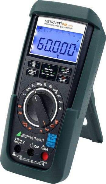 High-End TRMS System Multimeter mit 60.000 Digits Digitalanzeige, Datalogger und IR-Schnittstelle. Das METRAHIT PM XTRA ist ein Top Gerät der METRAHIT Professional Multimeter Serie.Die High-End TRMS Multimeter der METRAHIT PM Serie: METRAHIT PM TECH, XTRA und PRIME sind absolut robuste und zuverlässige Digitalmultimeter entwickelt für den professionellen Einsatz. Die Geräte präsentieren sich in attraktivem Design mit Gehäusen aus schlagfestem Kunststoff und technisch State of the Art.. Das METRAHIT PM TUNE ist ein Top Gerät der METRAHIT Professional Multimeter Serie. Topmoderne Qualitäts-Messinstrumente mit einzigartiger Präzision: 60.000 Digits und 0,05 % Grundgenauigkeit bieten ein Höchstmaß an Ergebnissicherheit. Modernste Technologie sorgt für ein Maximum an Sicherheit. Die Funktionsvielfalt deckt ein breites Spektrum anspruchsvoller Messaufgaben ab. Das innovative und ergonomische Design begeistert jeden Tag erneut.. TRMSAC, AC+DC Messung bis 100 kHz für Spannung und StromDatenlogger für 61.600 Messwerte und IR-Schnittstelle zum PCNetzteilanschluss. Die erhöhte Refresh-Rate der Digitalanzeige zeigt die Reaktion auf geänderte Einstellungen, z.B. an einem Potentiometer, unmittelbar ohne zeitlichen Versatz. Universell einsetzbar in allen Bereichen der Elektrotechnik! Echteffektivwertmessung bis 100 kHz mit 60.000 Digits Digitalanzeige und Analogskala Messung von Spannung und Strom, DC, AC und ACDC, dB, ?REL, Widerstand, Temperatur, Frequenz, Tastverhältnis, Kapazität, Durchgang / Dioden Automatische Messbereichswahl und Messwertspeicherung Sicherheit für den Anwender und das Gerät in den Messkategorien CAT IV bis 600V und CAT III bis 1000V. . Das Multimeter eignet sich für den universellen Einsatz in der Elektrotechnik, in den Bereichen Elektroinstallation, Labor, Fernmeldewesen, Schulung, usw.Das Gerät ist feldtauglich und besitzt eine interne netzunabhängige Stromversorgung. Der zusätzliche Netzteilanschluss ist ideal für Langzeitmessungen und Laboreinsatz.. 26 MultimeterfunktionenAuflösung ±60.000 Digits, 4 6/7-stelligGrundgenauigkeit ±0,05 % (VDC)Spannung ACTRMS, Spannung AC+DC TRMS , Spannung DC, Pegel dB, Relativwert ?REL, Frequenz (Hz, MHz), Tastverhältnis, Widerstand, Diodentest, Durchgangstest, Kapazität, Strom ACTRMS, Strom AC+DCTRMS, Temperatur mit Pt 100/1000 Sensoren u. K-ThermoelementenAutorange Strommessung von 10 nA bis 10 A (16A) über eine Buchse und eine SicherungClip Funktion für die TRMS Strommessung mit Sensoren und WandlernZusätzliche Filterfunktion und Spannungsmessung mit verringertem Eingangswiderstand zur Störbegrenzung, z.B. bei Messungen an FrequenzumrichternAutomatische und manuelle MessbereichswahlNullunktstellung ZEROAutomatische Messwertspeicherung DATA / MIN / MAX2 MB Datenspeicher für 61.600 Messwerte für Langzeitmessungen als DataloggerInfrarot Interface für Kommunikation mit dem PCgroßes, lichtblau beleuchtetes Display mit extra großen Ziffern (15mm) und analogem Bargraph für dynamische Vorgängegetrenntes Batterie- und SicherungsfachNetzteilanschluss für batterieunabhängigen BetriebPatentierte automatische Buchsen-Sperre ABSMesskategorie 600 V CAT IV, 1000 V CAT IIIGummischutzhülle zum Schutz gegen Stoss und Schlag. DAkkS Kalibrierschein inklusive36 Monate Garantie auf Material- und Fabrikationsfehler. 1 x Multimeter1 Paar Sicherheitsmessleitungen (1,5 m) mit 4-mm-Prüfspitzen, 1000 V CAT III, 600 V CAT IV (KS17-2)1 x Hartschalenkoffer HC202 x Batterien 1,5 V, Typ AA1 x Kurzbedienungsanleitung in Deutsch/Englisch1 x CD-ROM, Inhalt: Bedienungsanleitung in Deutsch und Englisch1 x DAkkS-Kalibriersch