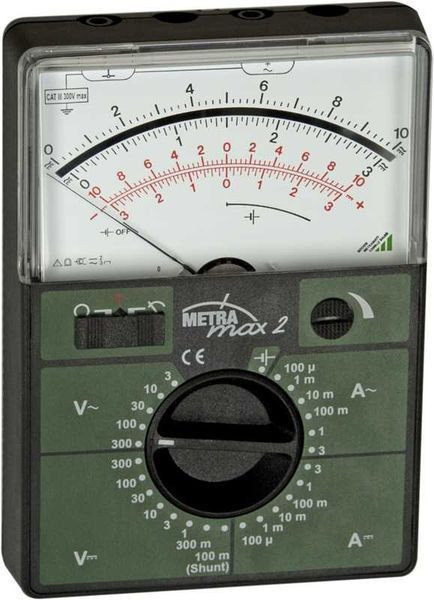 Analog-Multimeter für Ausbildung und Service. Das Hand-Multimeter METRAmax 2 wurde unter Mitwirkung eines namhaften deutschen Lehrsystemherstellers entwickelt und erfüllt somit die aktuellen Anforderungen, die an Unterricht und berufliche Ausbildung gestellt werden.Aufgrund hervorragender Überlastfähigkeit, wahlweiser Einstellung von Skalennullpunkt in Mitte oder links sowie automatischer Batterieabschaltung eignet sich das Gerät nicht nur für Schülerübungen sondern auch für Abgleich- und Revisionsarbeiten im Service.. Hohe Überlastfähigkeit und robuste Bauweise. Flexibler Nullpunkt wahlweise links oder in der Mitte. Kompakte Bauform, leichtes Gewicht und automatische Batterieabschaltung.. CE-Kennzeichnung Messkategorie CAT III Gehäuse-Schutzart IP 40 Spannungsmessung: 0 .. 100 / 300 mV / 1 V=; 0 .. 3 / 10 / 30 / 100 / 300 V= / ~Strommessung 0 .. 100 mA / 1 / 10 / 100 mA /1 / 3 A= / ~Nullpunkt links / mitteGenauigkeit: Klasse 2 = / 3 ~Abmessungen: 100 x 140 x 35 mmGewicht: ca. 0,3 kg inklusive BatterieBatterie: 9-V-Flachzellenbatterie IEC 6 LR 61 (6 F 22). 1 Multimeter (ohne Kabelset)1 Batterie1 Bedienungsanleitung