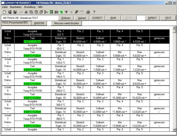 Kalibrier- und Justiersoftware für Tischkalibratoren Fluke 55xx. Mit METRAwin90-F, einem IEEE-488-Interface im PC und einem Kalibrator Fluke 5500A, 5520A oder 5700A läßt sich ein universelles, professionelles, automatisch arbeitendes "Closed Loop"-Kalibriersystem für die Multimeter der Reihe METRAHit zusammenstellen. Es eignet sich jedoch auch für den universellen Einsatz zum Kalibrieren von Analog- und Digitalmultimeter, Registriergeräten, Leistungsmessgeräten, Leistungsmessumformern, Verstärkerbaugruppen, Umformer, usw. Die Kalibrierprozeduren werden mittels METRAwin90-F erstellt. Die analogen Vorgabewerte werden vom PC mit dem IEEE 488-Interface auf den Kalibrator übertragen und von dessen Analogausgang in den Kalibriergegenstand eingespeist. Zur automatischen Übertragung der Messresultate vom Multimeter METRAHit auf den Rechner wird ein Adapter BD232 über ein RS232-Kabel mit diesem gekoppelt. Bei Messumformern wird der analoge Ausgabewert des Kalibriergegenstandes von einem METRAHit-Multimeter gemessen und über die Schnittstelle zur Auswertung auf den PC zurückgeführt. Liegt das Messergebnis innerhalb der vorgegebenen Toleranzen, dann wird automatisch der nachfolgende Kalibrierschritt generiert, bis die komplette Prozedur Schritt für Schritt abgearbeitet ist. . Die genannten Kalibratoren dienen vorwiegend zur Kalibrierung von anzeigenden Messgeräten wie Multimetern, Laborschreibern, Zangenstrommessgeräten, Einbaumessinstrumenten usw. und liefern die zahlreichen hierfür benötigten elektrischen Größen. Durch Einbindung eines Präzisionsmultimeters mit Infrarot-Schnittstelle vom Typ METRAHit 18S, 28S, 29S, 30M oder METRAHIT X-TRA, EXTRA, ENERGY in das Kalibriersystem kann auch eine automatisierte Kalibrierung von Isolierverstärkern, Trennwandlern, Messumformern u. ä. durchgeführt werden.Die Software realisiert die interaktive (Betriebsart DIREKT) oder ablaufgesteuerte (Betriebsart TEST) Einstellung des Kalibrators durch den PC über eine IEEE488-Schnittstelle, die automatische Beurteilung der manuell eingegebenen oder über eine RS232-Schnittstelle vom Multimeter eingelesenen Messwerte und die Dokumentation und Archivierung der Kalibrierergebnisse in einem Kalibrierprotokoll. Auf Basis der in der Software integrierten Genauigkeitsspezifikation der Kalibratoren berechnet das Programm für jeden Kalibrierpunkt das Prüfunsicherheitsverhältnis TUR (Test Uncertainty Ratio) oder die Gesamt-Messunsicherheit gemäß der Richtlinie DKD-3 (WECC 19-1990).Eine Kalibrierprozedur für das jeweilige Kalibrierobjekt kann unkompliziert erstellt und getestet werden. Für zahlreiche Multimeter aus unserem aktuellen und früheren Geräteprogramm sind getestete Kalibrierprozeduren im Lieferumfang enthalten.. Kalibrier- und Justiersoftware für FLUKE Multifunktions-Kalibratoren D9100, 5100B, 5500A, 5520A, 5700A Automatisierte Kalibrierung von Handmultimetern der Serien METRAHit ..S / ..M / ..A mit Infrarot-Schnittstelle Justieren der Handmultimeter METRAHit 22-29S /M via Schnittstelle RS232 Einfaches, schnelles Generieren, Testen und Dokumentieren von Kalibrierprozeduren Unkomplizierte Bedienung: auch angelernte Kräfte können qualifizierte Kalibrieraufgaben durchführen Hohe Anwendungsflexibilität durch Nachführen des Kalibriersignals, durch Tastatureingabe oder durch Schnittstelle Dokumentation über Ausdruck als Standard-Kalibrierprotokoll oder als anwenderspezifisches Zertifikat Dynamischer Datenaustausch zu Microsoft EXCEL, WORD Dokumentation enthält alle erforderlichen Angaben für Zertifikate nach EN ISO 9000 Entsprechend DKD-3 „Ermittlung der Messunsicherheit