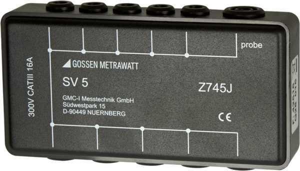 Prüfsondenverteiler . Prüfsondenverteiler zum Anschluss von 5x 4 mm und 5x 2 mm Prüfsonden zur gleichzeitigen Messung mehrerer berührbarer Gehäuse- oder Anwendungsteile..